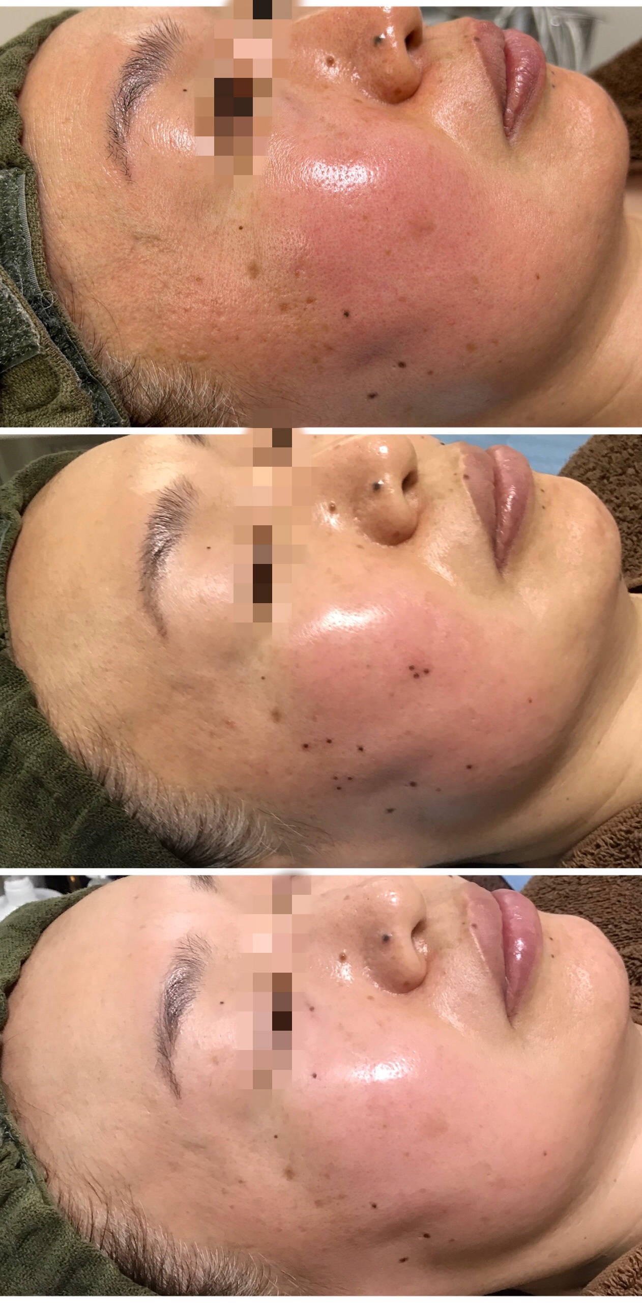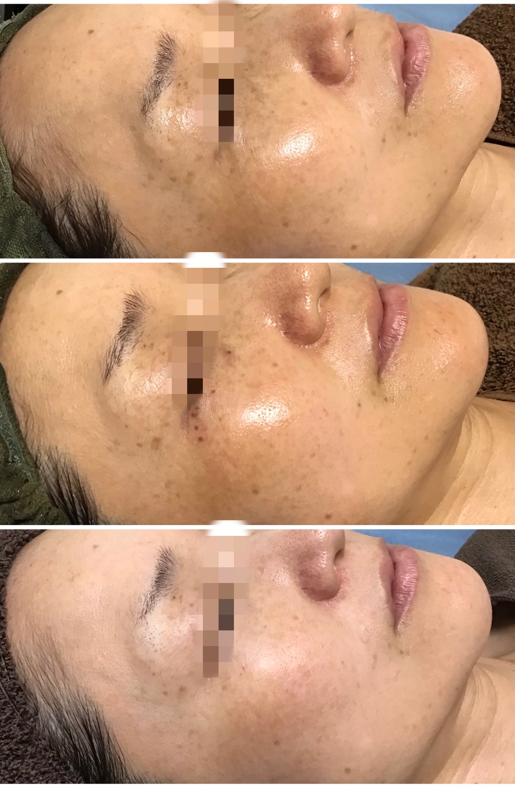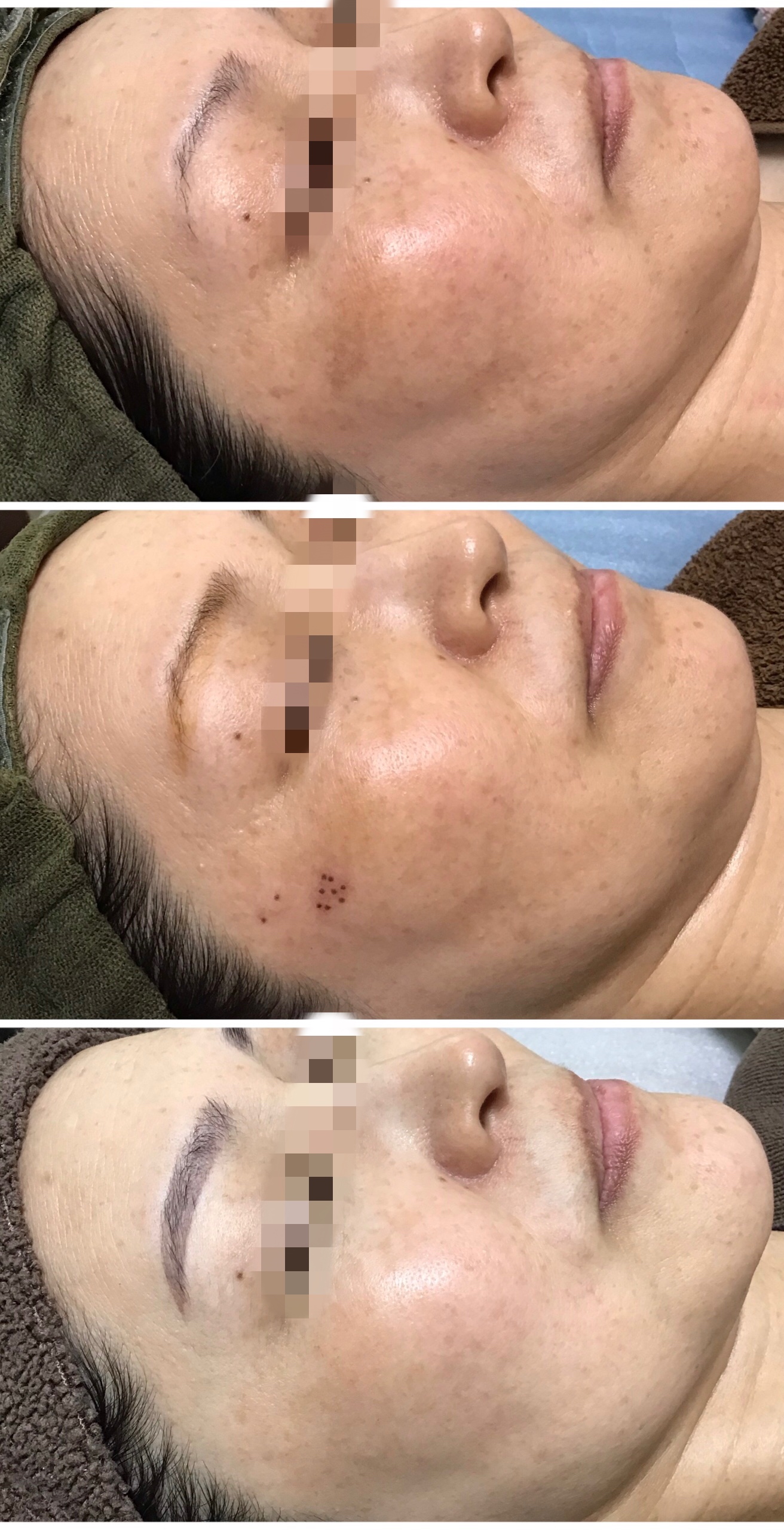当店では、最新のシミケアマシンで、シミの箇所にピンポイントで47度の低周波を与えます。すると、お肌の奥に潜んでいるシミの元のメラニンが縮み、上へ上へと押し上げられ、小さな黒子のようになります。黒子状のものは3日〜1週間でターンオーバーによって剥がれ落ちます。