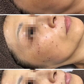 当店では、最新のシミケアマシンで、シミの箇所にピンポイントで47度の低周波を与えます。すると、お肌の奥に潜んでいるシミの元のメラニンが縮み、上へ上へと押し上げられ、小さな黒子のようになります。黒子状のものは3日〜1週間でターンオーバーによって剥がれ落ちます。